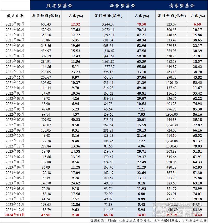 不过,从新发基金的类型来看,债券型基金依旧是“主力”。1月份债基发行份额为352.19亿份,占比高达74.60%,同期股票型和混合型基金新发份额占比合计仅约23%。机构人士指出,从公募基金发行市场看,近期,主被动纯债基金是市场积极布局的方向,或与权益市场持续偏弱势有关。