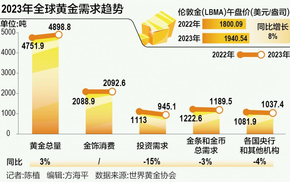 世界黄金协会资深市场分析师Louise Street表示,2023年全球央行的持续购金再次有力地提振黄金需求,并一定程度抵消黄金市场其他领域需求的疲软,令全年黄金需求远高于近十年的移动平均值。