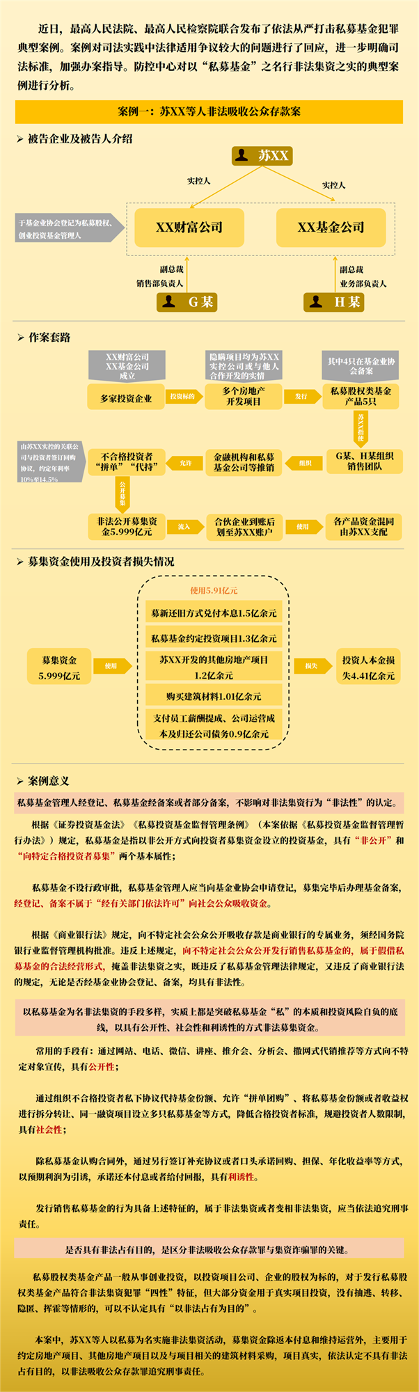 近日,最高人民法院、最高人民检察院联合发布了依法从严打击私募基金犯罪典型案例。案例对司法实践中法律适用争议较大的问题进行了回应,进一步明确司法标准,加强办案指导。防控中心对以“私募基金”之名行非法集资...