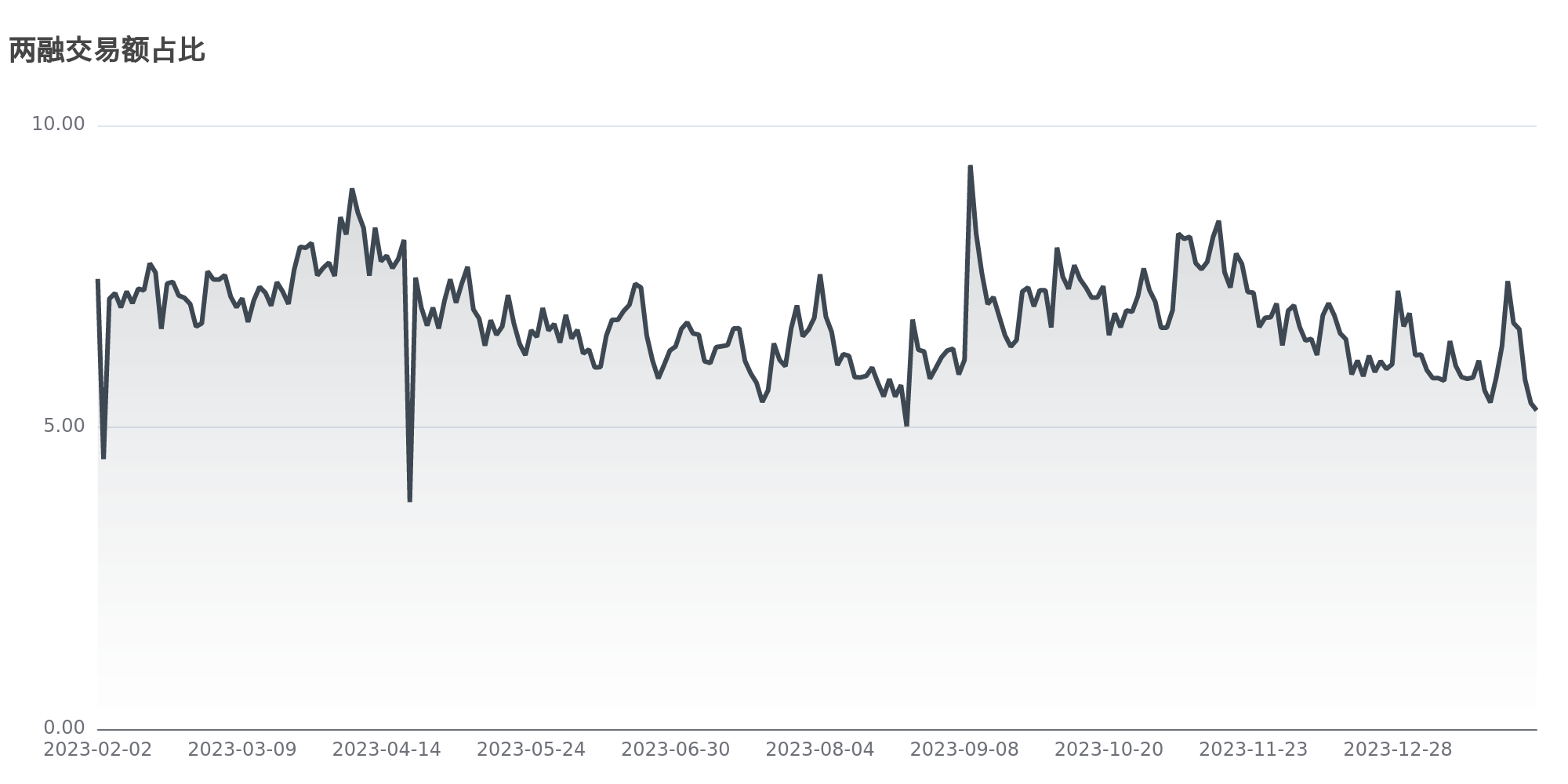 今日该指标值为5.28%,目前该指标处于近一年较低区间,说明投资者认为A股市场趋于触底反弹。反映场内投资者借钱炒股的杠杆水平,该指标越高说明杠杆水平越高,即投资者认为当前市场较强,反之则说明投资者认为市场相对较弱,因而与上证指数存在较强的正相关性。