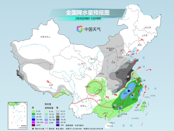 明天,新疆南疆西部山区、陕西大部、内蒙古中部和东南部、华北大部、黄淮、江淮、江汉、湖南中北部、西藏西部和南部等地部分地区有小到中雪或雨夹雪,其中,山东南部、河南东部、安徽中北部、江苏北部、湖北东部、湖南北部等地部分地区有大雪,局地暴雪。湖北东部、湖南中北部等地部分地区有冻雨。江南大部、华南北部等地部分地区有中到大雨,其中,江西北部局地有暴雨。