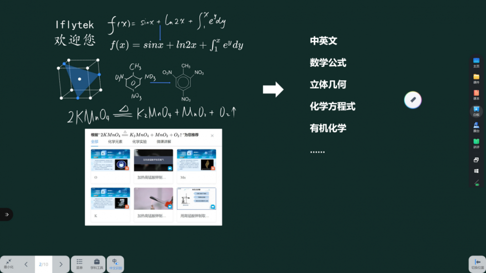 具体来说,星火智慧黑板基于多要素OCR识别技术和智能推荐引擎,实现了对中英文、立体图形、化学方程式等9种要素的手写识别。