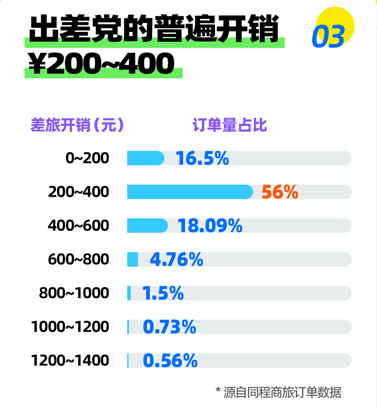 各省市(含港澳台)差标高低差异较为明显,差标最高的澳门相比河南高出6倍之多!多数普通商务出行者的标准为200~400元区间,而200元以下的订单16.5%占比也很可观,主打省钱的差旅有多痛家人们谁懂?