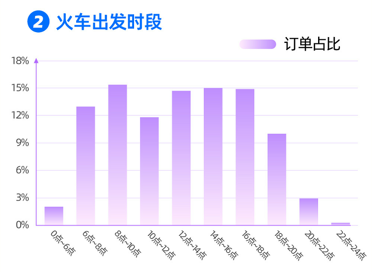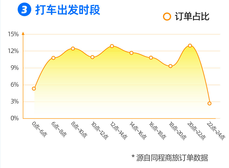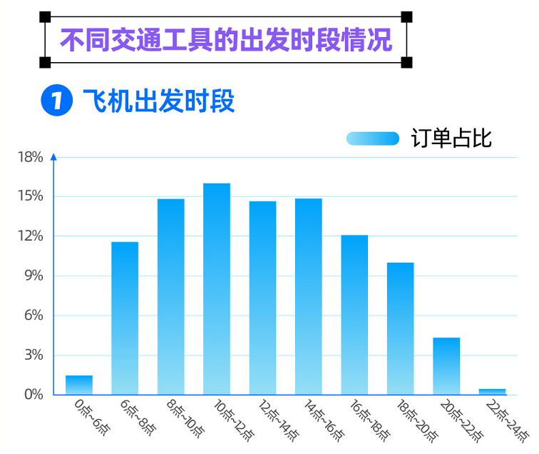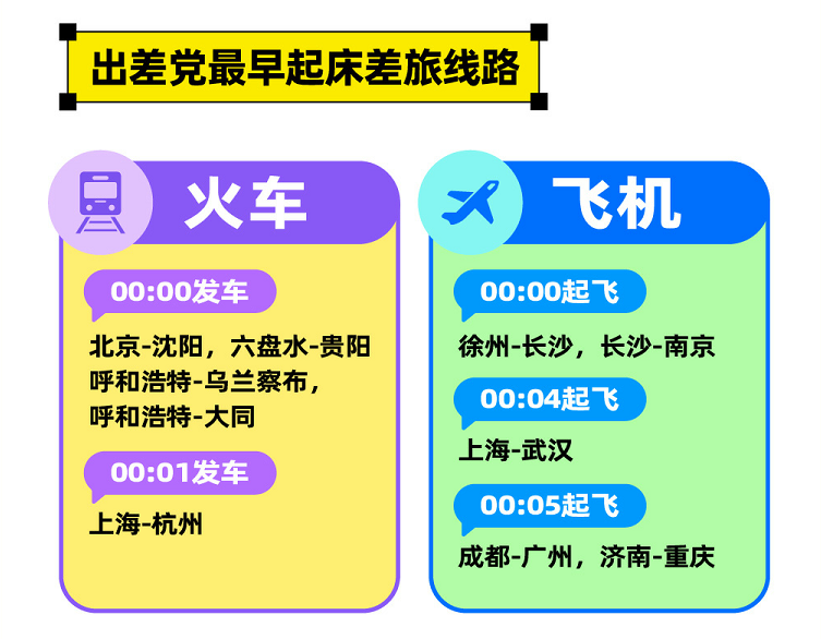 乘坐交通工具决定了出发时间的不同,飞机主要在10~12点,火车8~10点,有4.06%的差旅人夜间22点至凌晨6点之间仍在路上,而早上更有零点整就起程上路,把披星戴月刻进DNA。