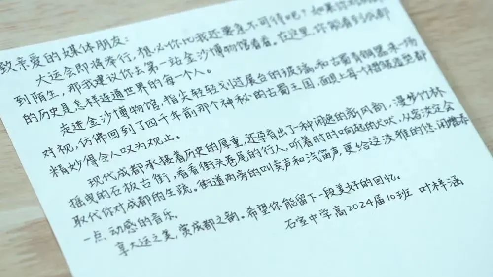 大运会主媒体中心媒体服务经理付晓曦觉得最温暖的事,是每一名参加成都大运会报道的中外记者,在报到时都收到了一个沉甸甸的媒体包,其中,有一封成都各个学校的孩子们手写的“给媒体记者的信”。火锅文化、国宝熊猫、成都老街、古蜀文明……一封封满载着成都文化与底蕴的信件,饱含“成都欢迎您”的热情。