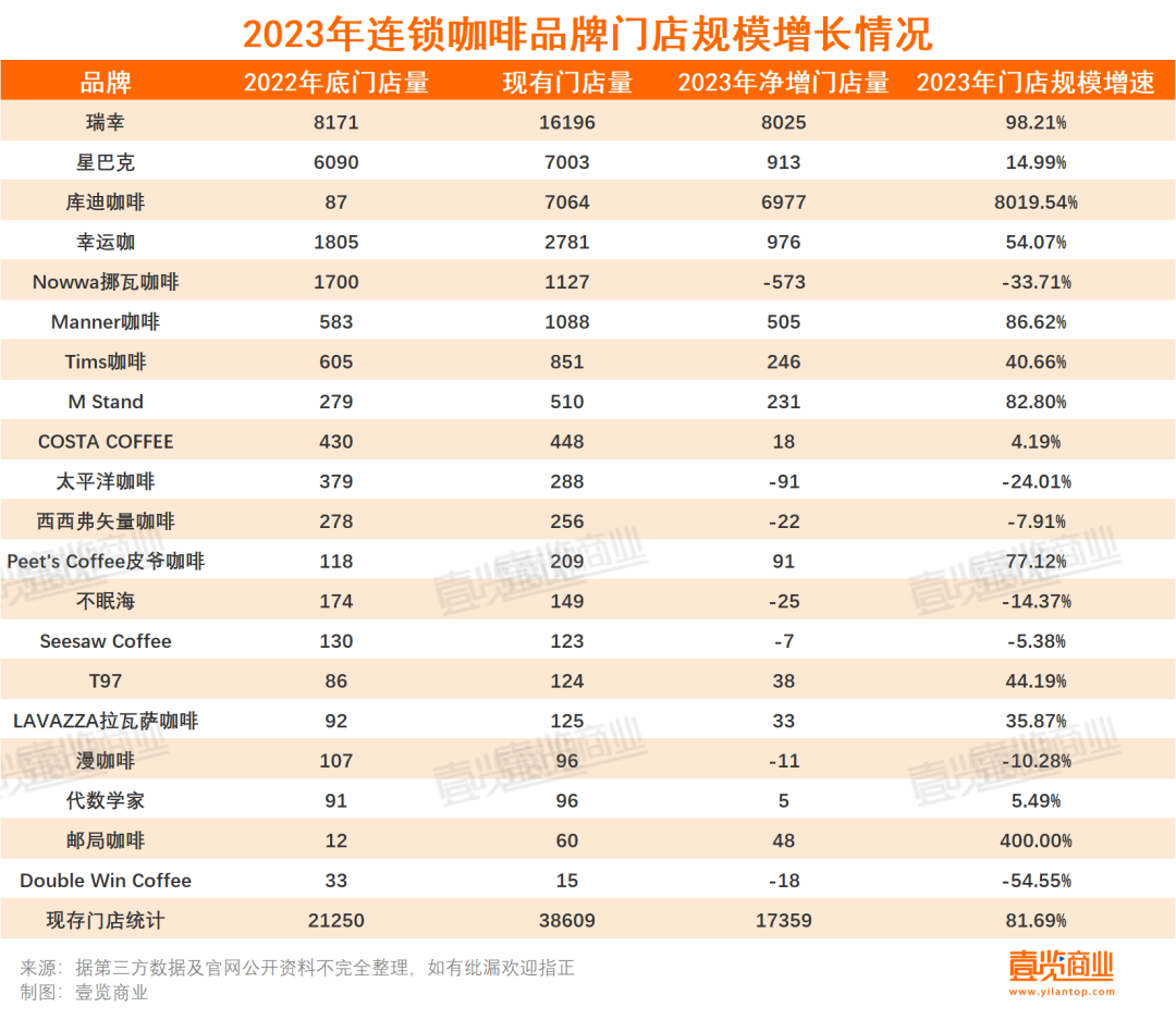 从门店数量看,壹览商业长期追踪的连锁咖啡品牌从2022年底的21250家门店扩张至2023年底的38609家门店,增速高达81.69%,其中又以库迪为最——一年新开门店近7千家,增速超8000%。不少品牌有样学样,开始拓展商业版图。