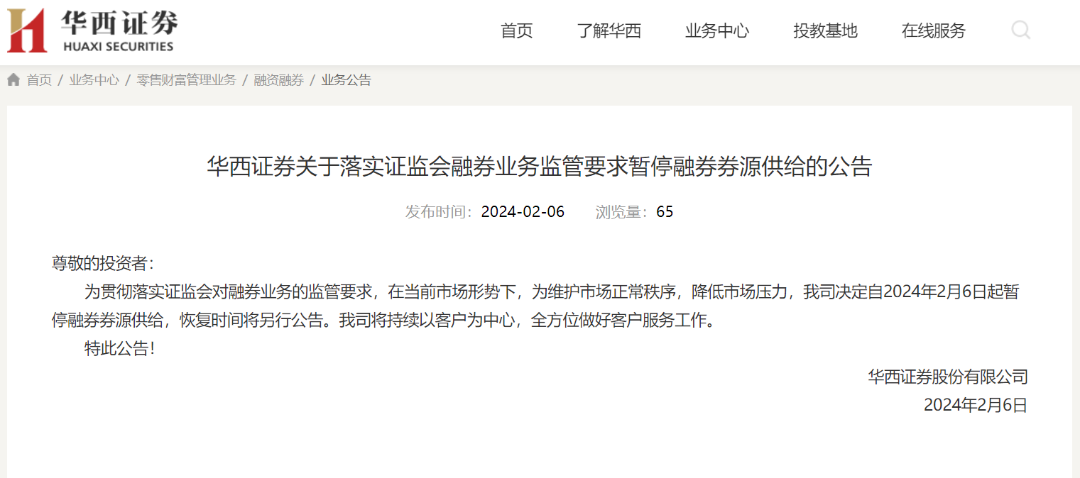 华西证券官网2月6日公告,为贯彻落实证监会对融券业务的监管要求,在当前市场形势下,为维护市场正常秩序,降低市场压力,公司决定自2024年2月6日起暂停融券券源供给,恢复时间将另行公告。