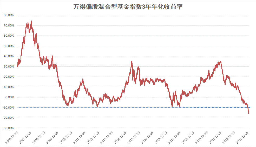 而历史上,每当万得偏股混合型基金指数3年年化收益率到-10%左右的时候,会开启反弹。但这一次,已经跌破-10%这一“边界”,创下了历史新低。