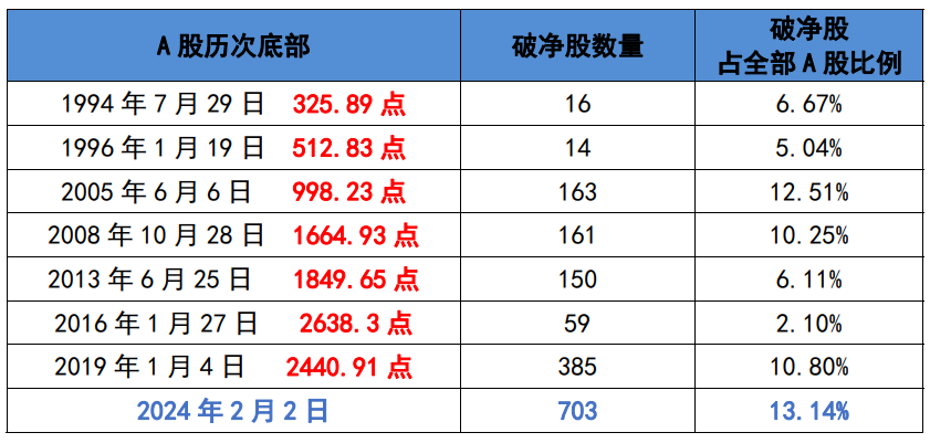 2024年2月2日,A股破净股数量达到703只,占全部A股的比例为13.14%。