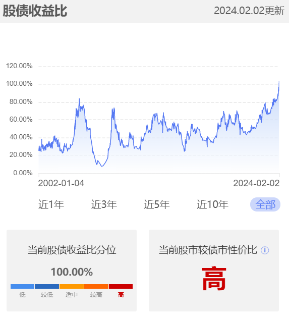 2024年2月2日,股债收益比已经超过1,创下了历史新高。
