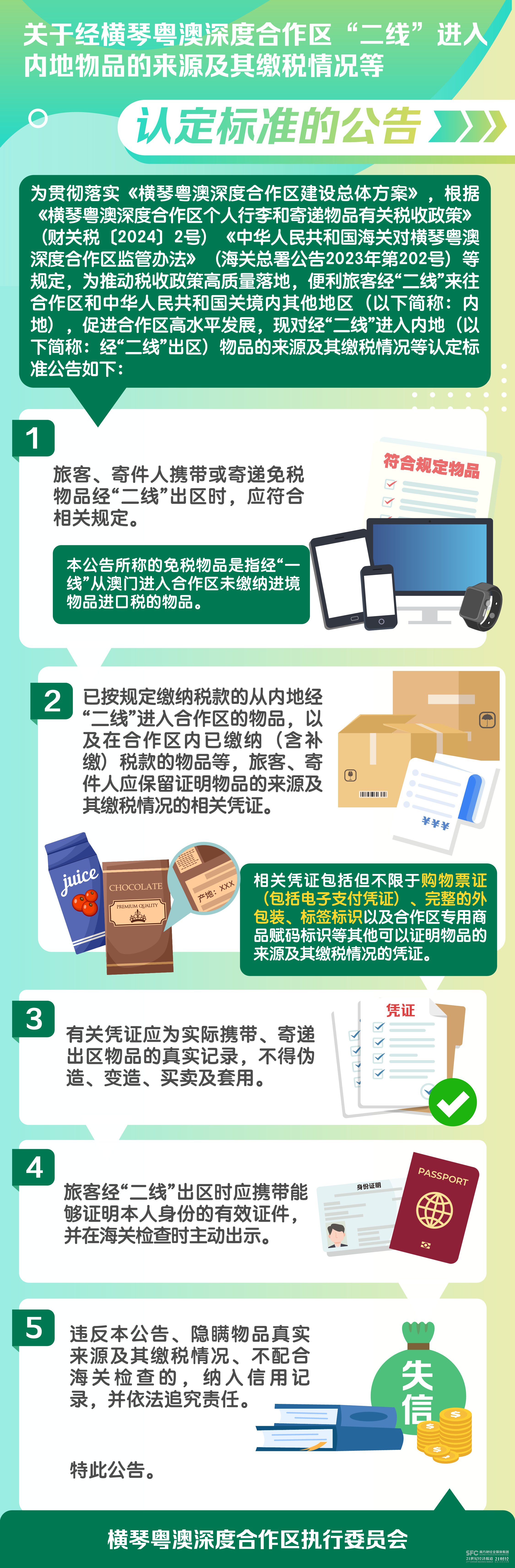 2月9日,合作区执行委员会发布《关于经横琴粤澳深度合作区“二线”进入内地物品的来源及其缴税情况等认定标准的公告》(简称:《公告》),公布了对经“二线”进入内地(简称:经“二线”出区)物品的来源及其缴税情况等认定标准。