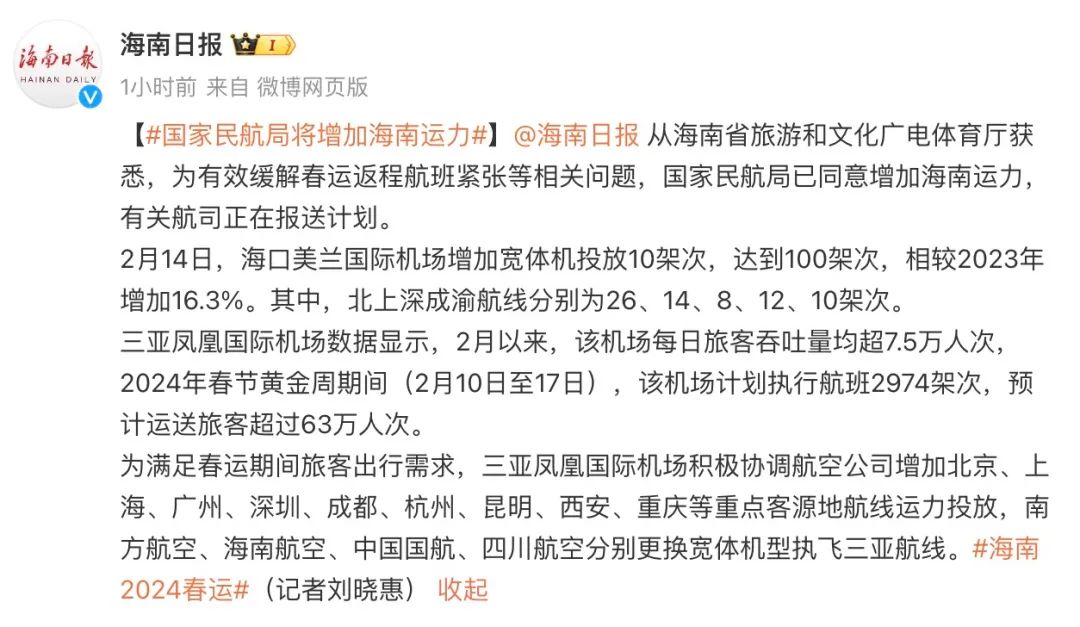 海南省旅游和文化广电体育厅消息,为有效缓解春运返程航班紧张等相关问题,国家民航局已同意增加海南运力,有关航司正在报送计划。