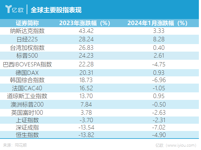 但实际走势并不乐观,政策一直在发力,A股并不买账,大盘指数在震荡中持续下挫。放眼全球,2023年A股在重要指数中增速排名依然靠后,上证指数全年下跌3.70%,深证成指全年下跌13.54%。