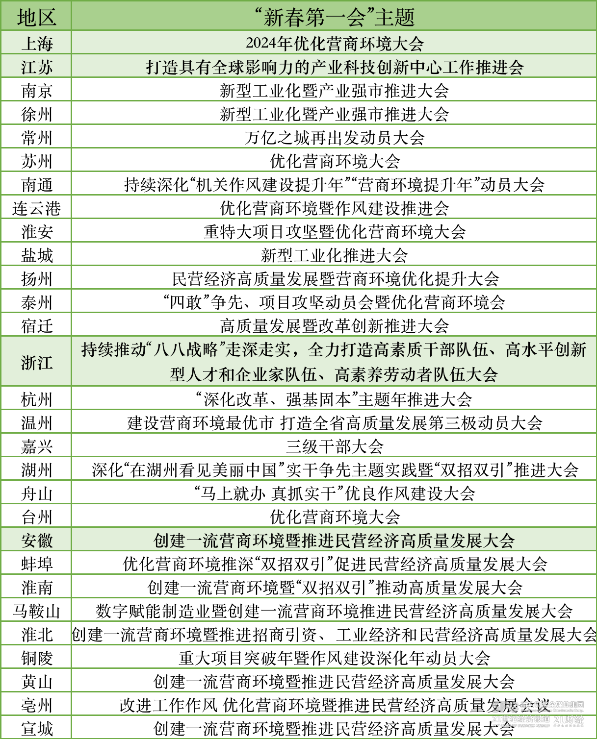 安徽“新春第一会”召开翌日,蚌埠、马鞍山、淮北、黄山、亳州、宣城纷纷开会部署民营经济发展。此外,扬州等城市的“新春第一会”也紧扣民营经济主题。