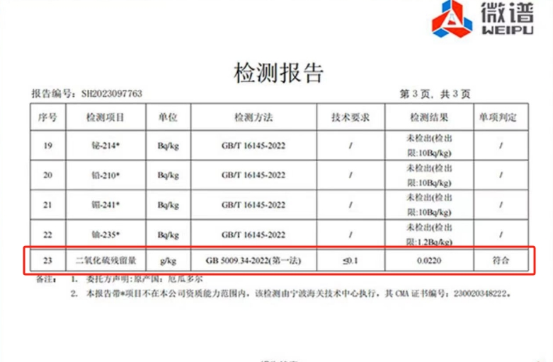 另外,客服向中新经纬提供的商品检测报告中显示,报告第三页显示产品有二氧化硫残留,残留量为每千克0.0220克,报告上判定为符合标准。