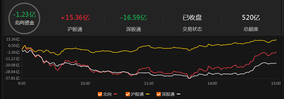 北向资金尾盘回流,全天小幅净卖出1.23亿元,一度净卖出近40亿元;其中沪股通净买入15.36亿元,深股通净卖出16.59亿元。