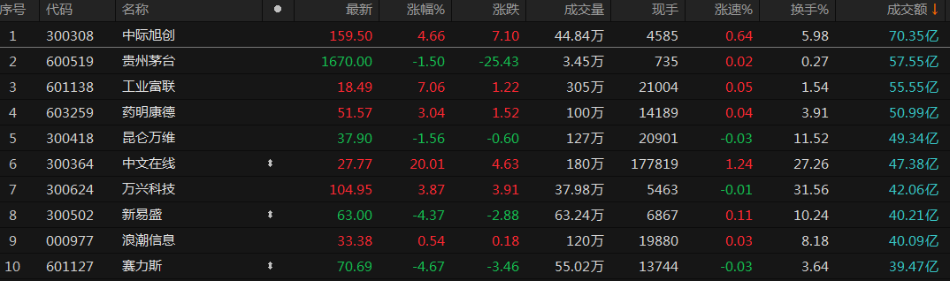 沪深两市今日成交额7895亿,较上个交易日缩量1677亿。个股方面,中际旭创成交额70.35亿元居首,贵州茅台、工业富联、药明康德成交额居前。