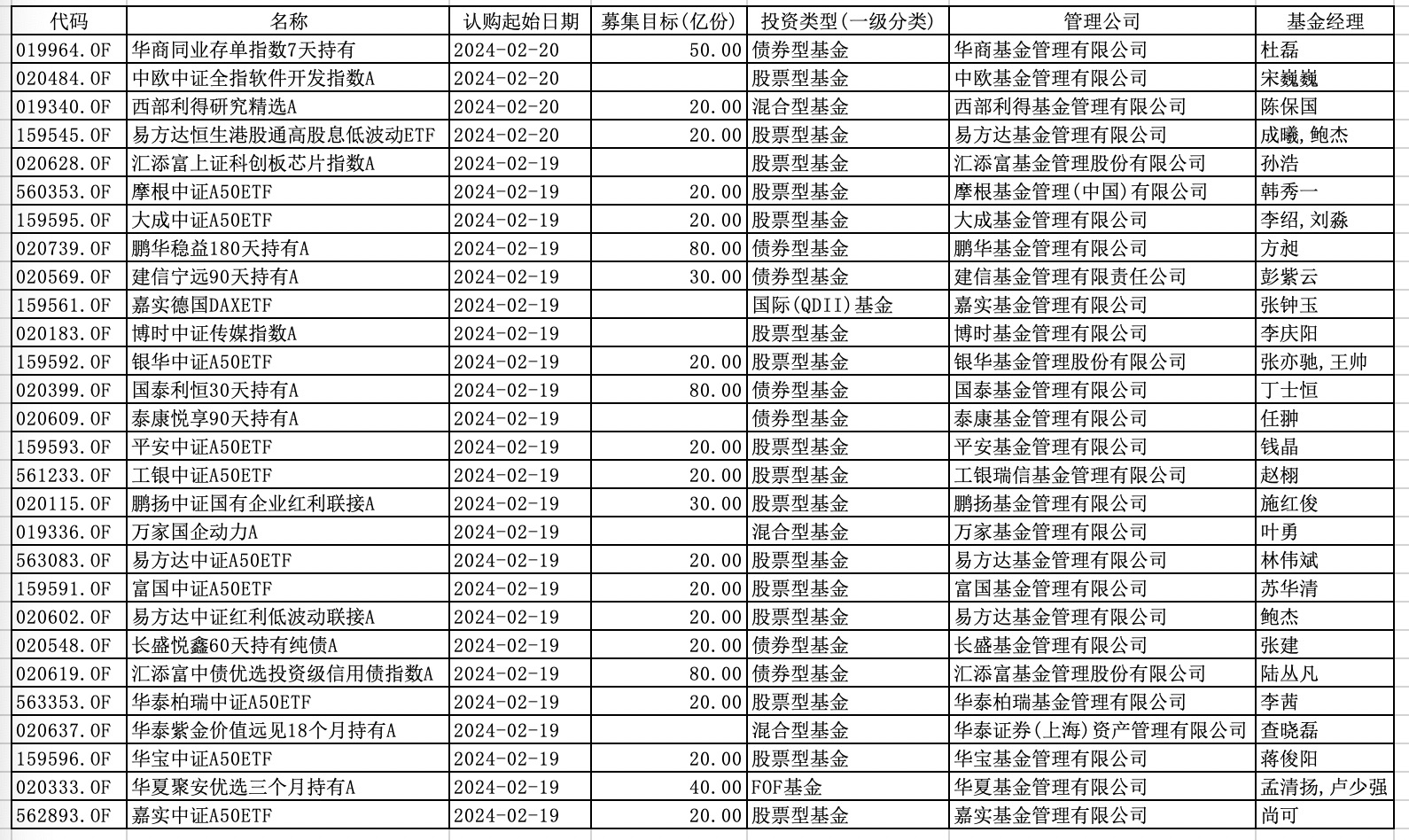 2月19日,24只新基金集中首发,整体来看,权益类新发基金数量占比近七成,这意味着,公募机构正积极布局权益市场。2月20日,又有中欧中证全指软件开发指数A、易方达恒生港股通高股息低波动ETF、西部利得研究精选A、华商同业存单指数7天持有等4只产品同时上线。