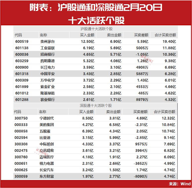 从北上资金、融资盘净买入的方向来看,也是以大金融板块为主。 如2月19日和20日,在沪股通和深股通(北上资金)前十大活跃个股(见附表)中,银行板块的招商银行、农业银行、工商银行,保险板块的中国平安,以及券商板块的东方财富均位列其中。
