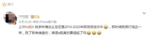 对此,有投资者充满了期待,其指出,“(上一次)做多热情这么足还是2019-2020年那波波‘迷你牛’,那时候就跟打鸡血一样,跌了就有接盘的,难道A股真的要崛起了吗? ”