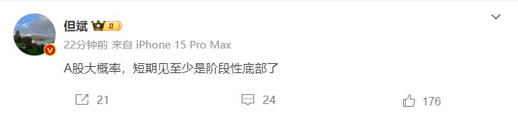 而对于A股市场当前的上涨,一向对盘面较少发表意见的东方港湾董事长但斌也公开表示, “A股大概率,短期见至少是阶段性底部了。”