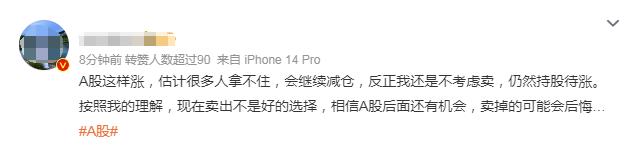 但看多A股后市的投资者似乎更多。 如有投资者表示,“A股这样涨,估计很多人拿不住,会继续减仓,反正我还是不考虑卖,仍然持股待涨。 按照我的理解,现在卖出不是好的选择,相信A股后面还有机会,卖掉的可能会后悔…”