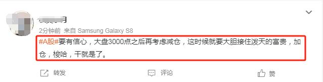 也有投资者指出,“要有信心,大盘3000点之后再考虑减仓,这时候就要大胆接住泼天的富贵。 ”同时,该投资者表示,“加仓,梭哈,干就是了。 ”