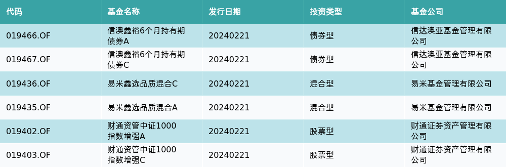 2月21日有6只新基金发行,分别为:信澳鑫裕6个月持有期债券A、信澳鑫裕6个月持有期债券C、易米鑫选品质混合C、易米鑫选品质混合A、财通资管中证1000指数增强A、财通资管中证1000指数增强C,详情见下表: