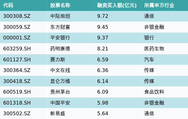 2月21日,两市共有3333只个股有融资资金买入,其中中际旭创、东方财富、平安银行排名前三,买入金额分别9.72亿元、9.45亿元、9.37亿元。融资买入额前10个股详情见下表: