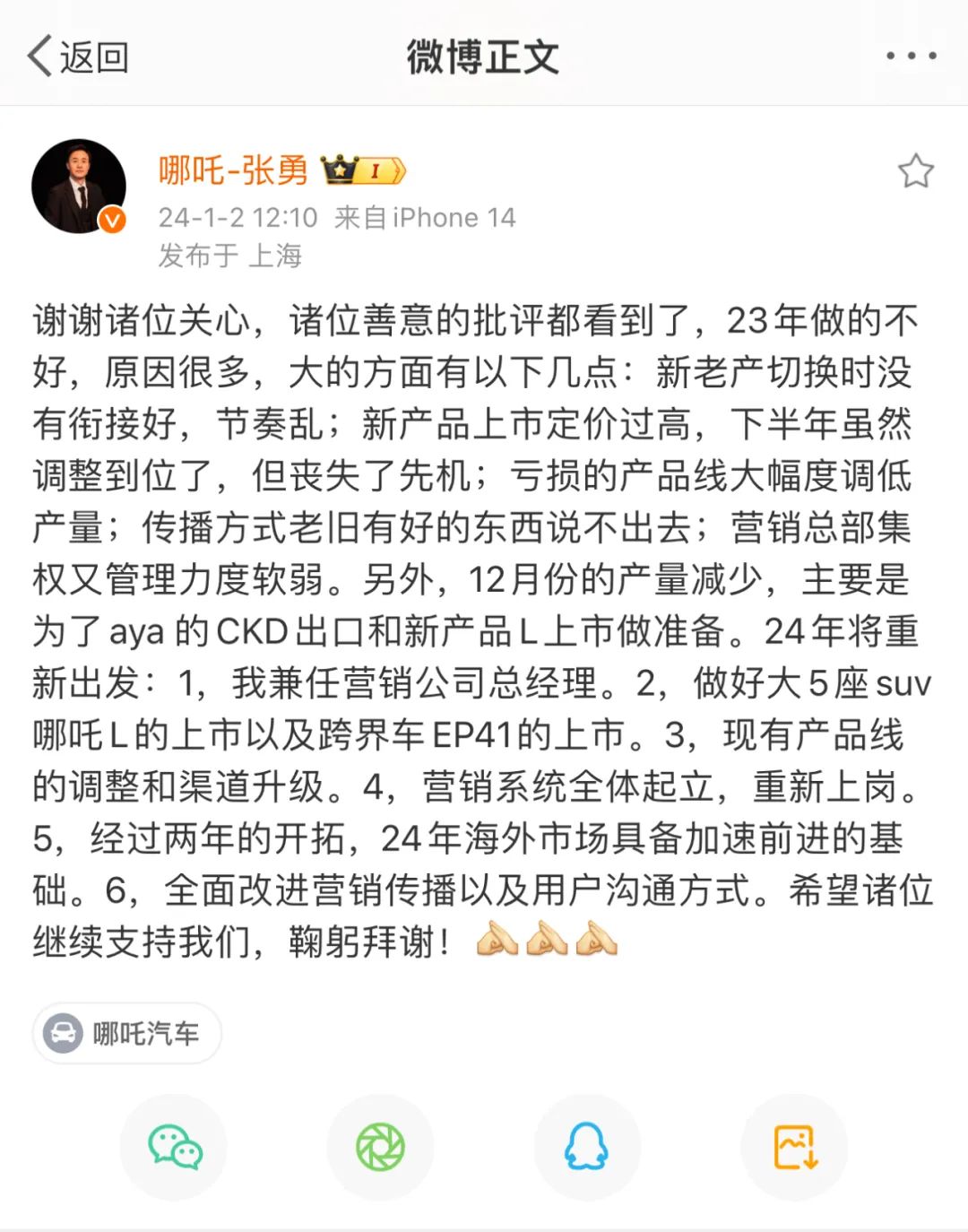 哪吒汽车CEO张勇在微博公开反思去年短板,图源张勇个人微博