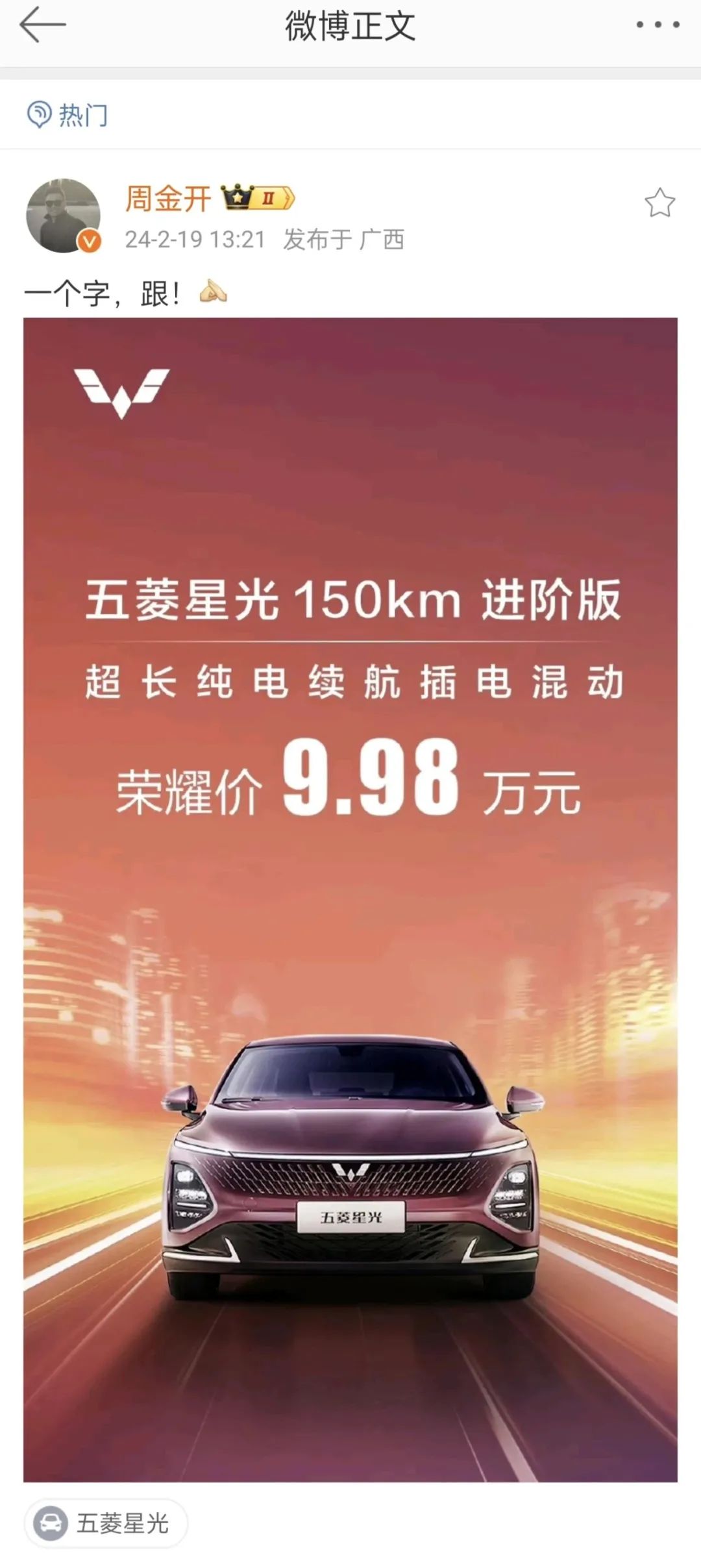 2月19日,上汽通用五菱品牌事业部副总经理周钘发微博写道“一个字,跟!”,宣布旗下五菱星光插混车型150km进阶版,售价由10.58万元调整为9.98万元,降至10万元以内。