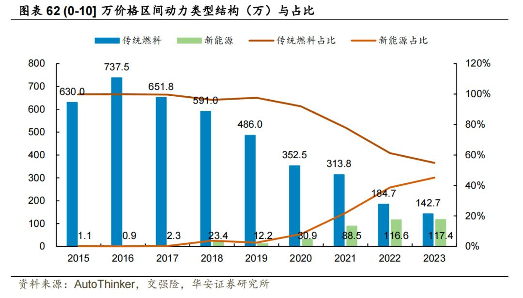 不过根据华安证券统计,近几年,处于这一价格带的燃油车销量规模和新能源车销量规模,实现了“一降一升”: