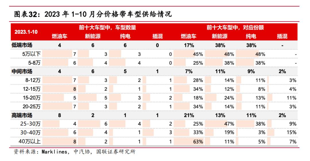 国联证券在一份研报中指出,按价格带来看,2023年,在低端市场新能源车型竞争力较强,前十大车型中,新能源车数量(对应份额为38%)已经超过燃油车(对应份额为17%)。