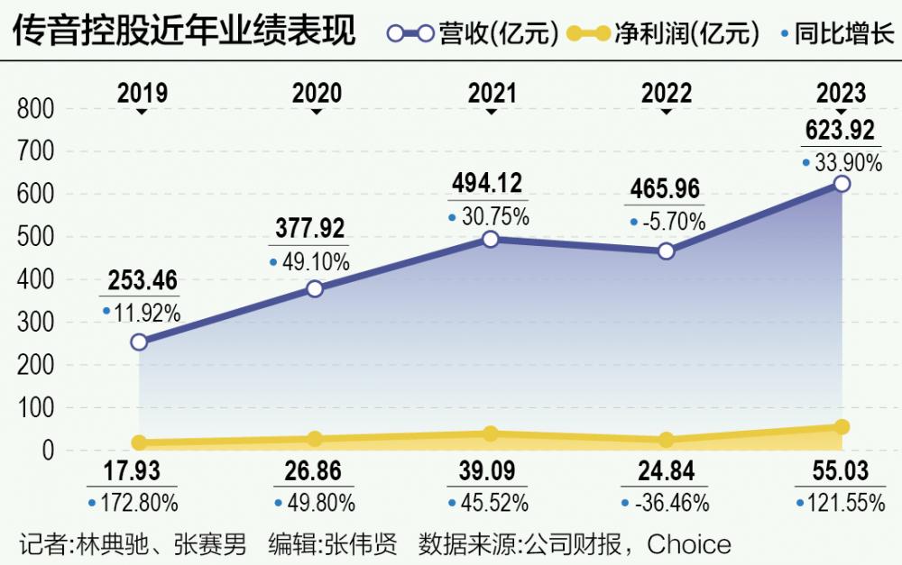 2024年2月22日,传音控股(688036.SH)公布业绩快报,全年营收623.92亿元,同比增长33.9%;归母净利润达到55.02亿元,同比增长121.55%。