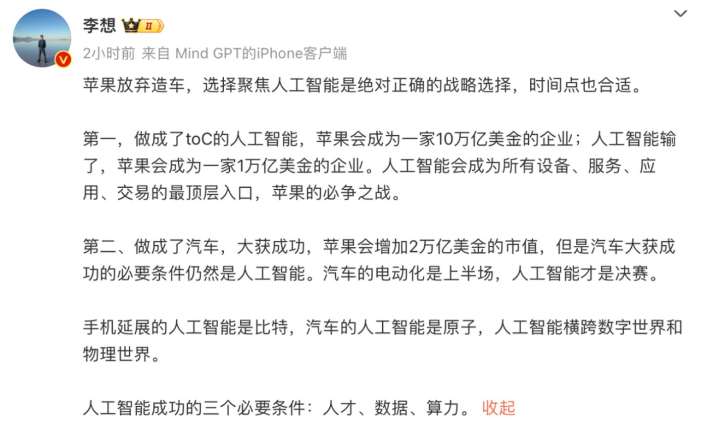 接下来,多位国内新能源汽车行业大佬也纷纷在社交平台作出回应。理想汽车CEO李想表示,苹果放弃造车,选择聚焦人工智能绝对是正确的战略选择。