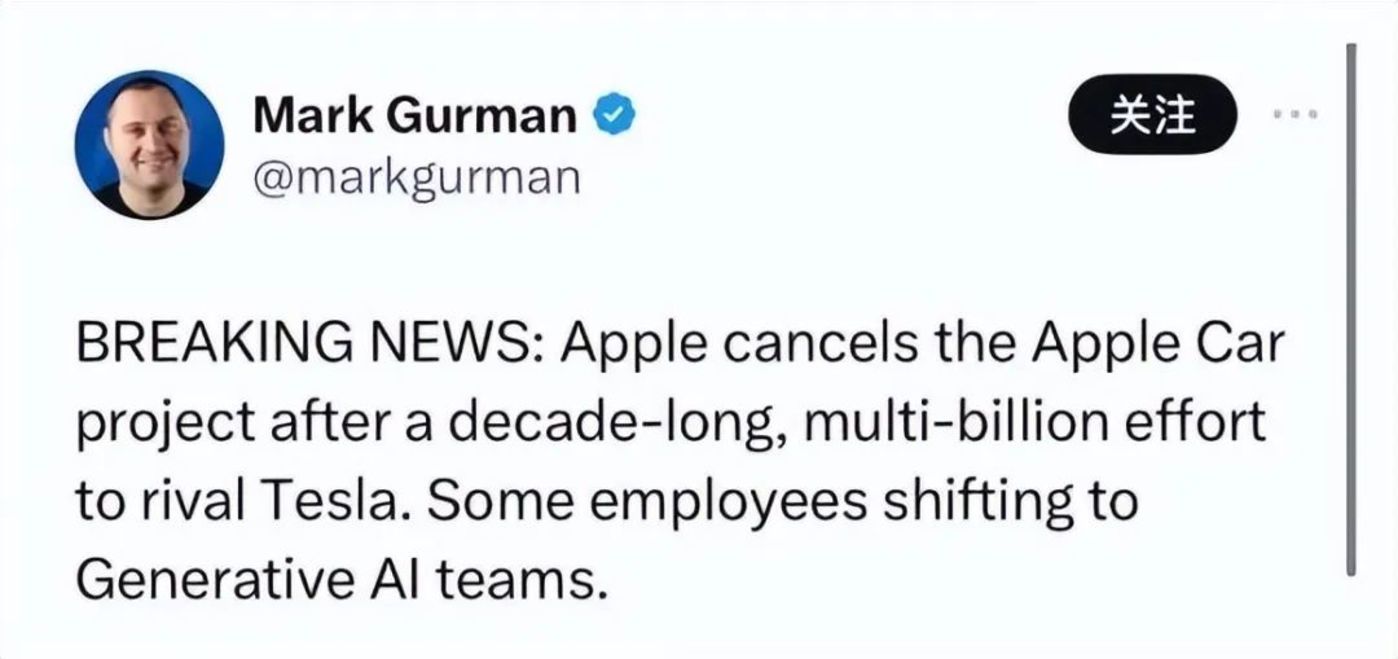 日前,知名科技记者马克·古尔曼在社交平台上透露,苹果将取消了长达十年、投入数十亿美元的造车计划,部分员工将被转入人工智能部门。