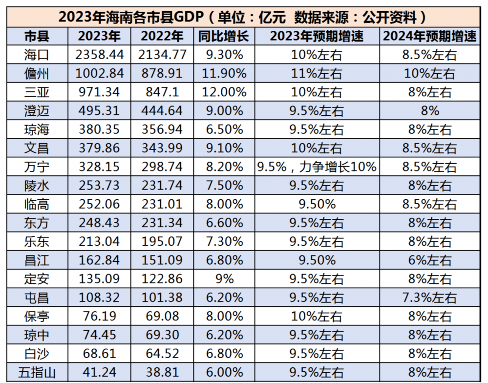 2024年,共有5个市县的预期增速超过全省“8%左右”的平均线,分别是海口、儋州、文昌、万宁、临高。