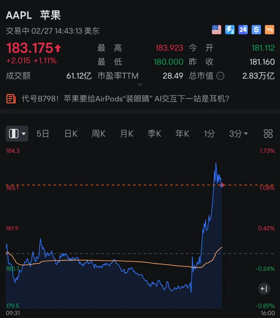 毫无疑问,今天科技圈最大的新闻是苹果宣布终止造车项目。要知道,这个名为泰坦的项目,苹果进行了十几年之久。这对于那些对苹果汽车抱有热情和期待的果粉来说,是一件充满遗憾的事。但资本市场的反应,却恰恰相反。在苹果做出这个决定后,苹果股价居然应声上涨。最终在纽约市场以182.63美元收盘,涨幅约为1%。