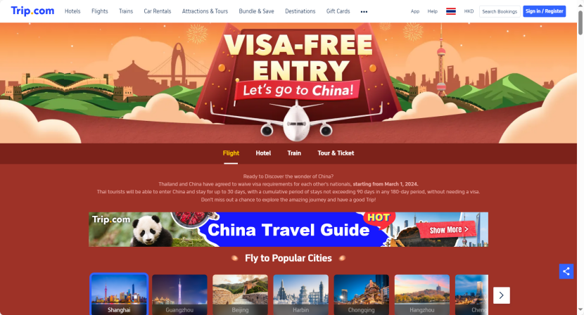更重要的是,相互免签将吸引更多泰国游客来华旅游。携程数据显示,3月1日当天,泰国游客赴华旅游订单同比增长3倍,较2019年增长超160%。泰国游客最热衷的中国城市包括上海、广州、昆明、北京、成都、重庆、杭州、丽江、深圳等。携程国际版泰国站点早已上线中国旅游推介活动,介绍中国旅游城市,并提供机票、酒店预订等服务。3月1日泰国站点内,中国相关关键词搜索热度同比增长3倍多,环比一个月前(春节前夕)增长超一成。