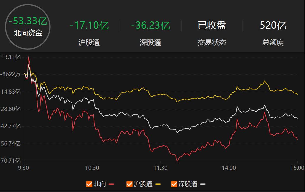 北向资金全天净卖出53.33亿元,其中沪股通净卖出17.1亿元,终结连续23日加仓势头;深股通净卖出36.23亿元。本周北向资金累计加仓超235亿元,连续5周净买入。