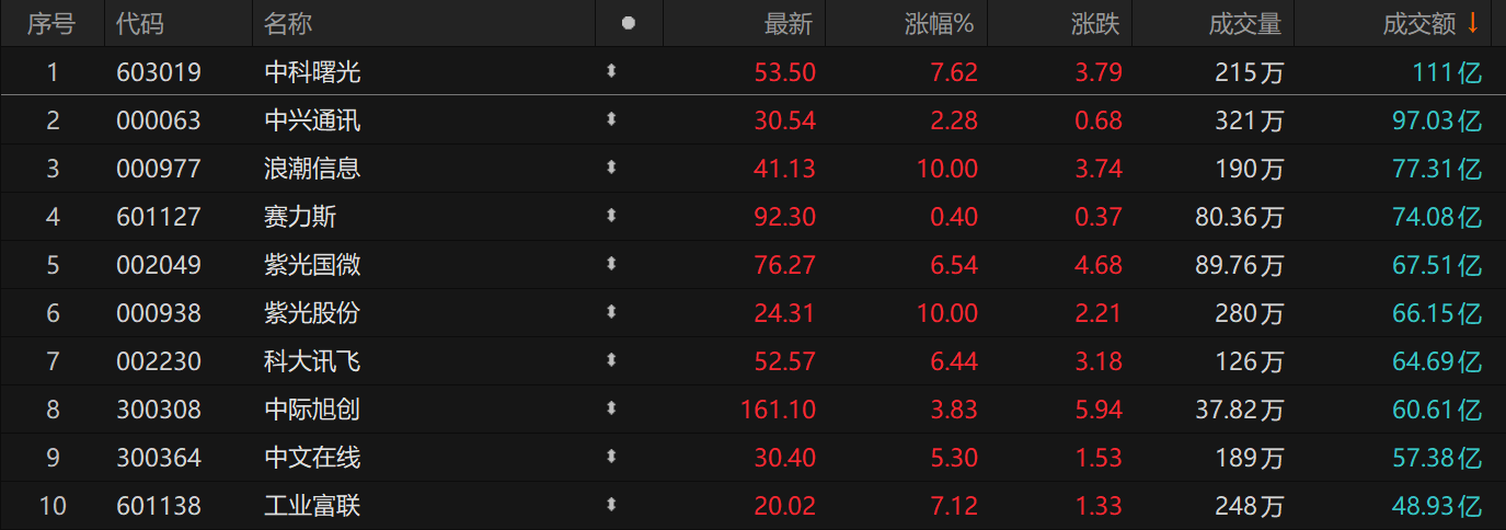 个股方面,中科曙光成交额111亿元,中兴通讯、浪潮信息、赛力斯、紫光国微、紫光股份等成交额居前。