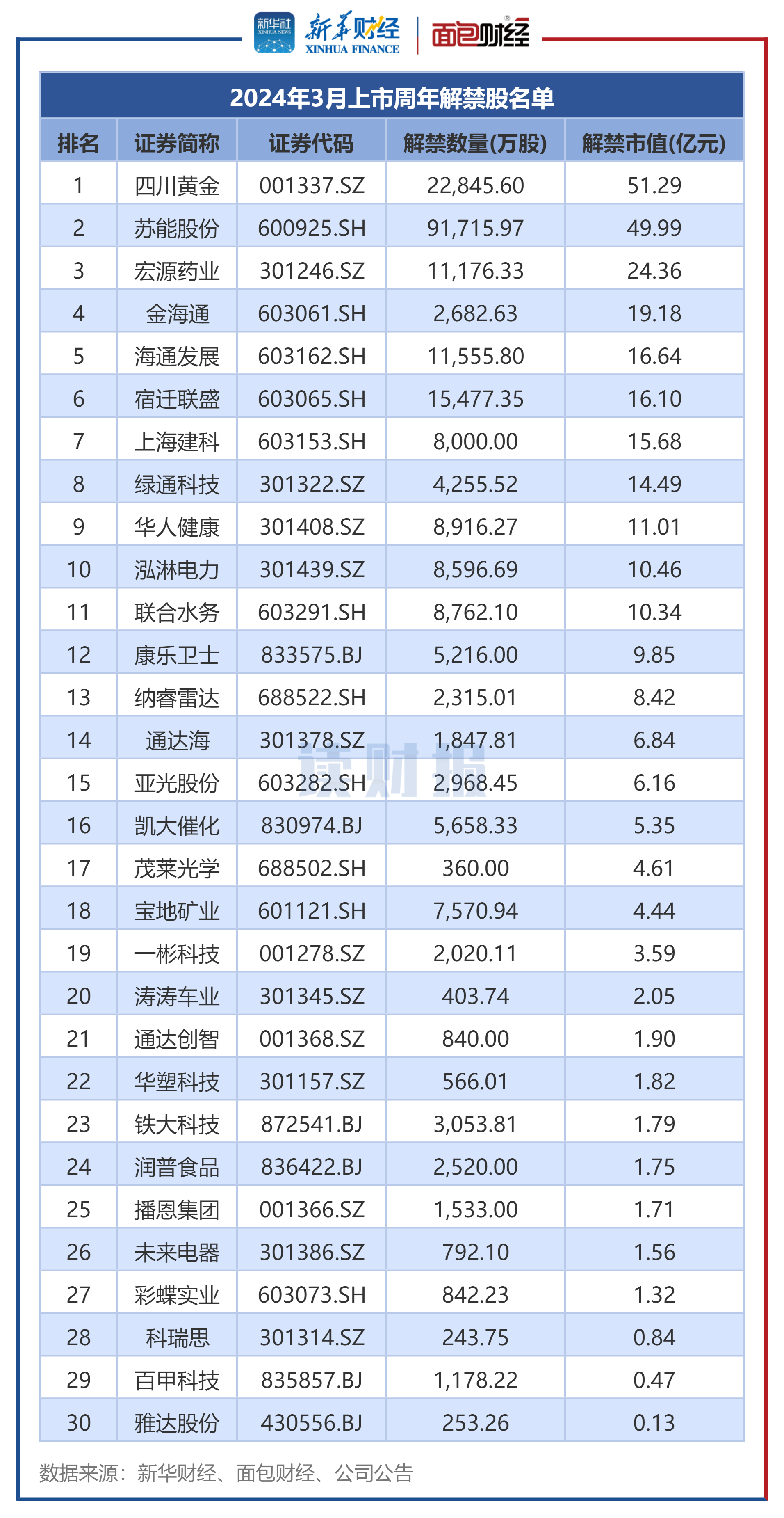 此外,共有30家公司、23.42亿限售股于3月迎上市周年解禁,解禁市值为304.14亿元,包括四川黄金、苏能股份、宏源药业等企业。