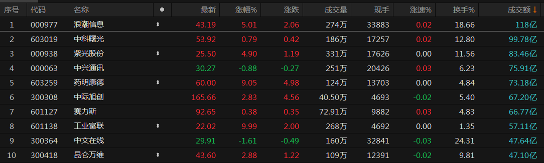 个股方面,浪潮信息成交额118亿元,中科曙光成交额接近100亿元,紫光股份、中兴通讯、药明康德成交额均居前。