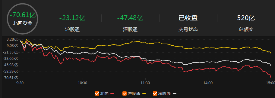 北向资金全天净卖出70.61亿,其中沪股通净卖出23.12亿元,深股通净卖出47.48亿元。