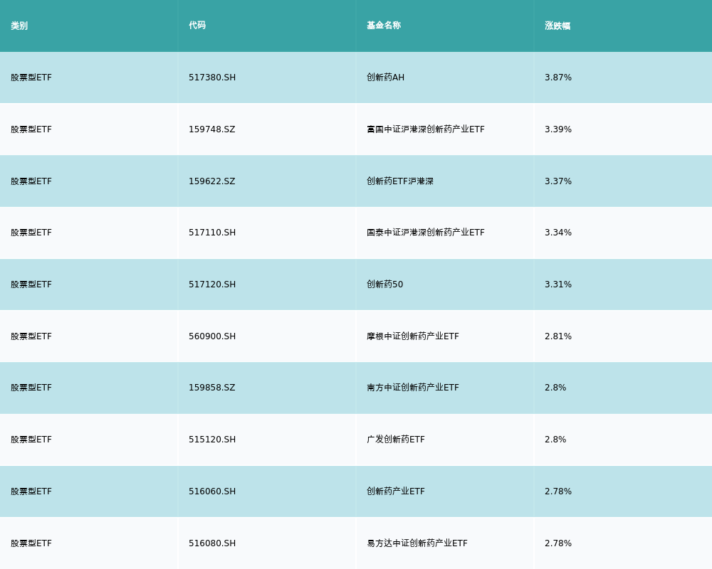 昨日股票型ETF涨幅最高的3支ETF及其收益率分别为:创新药AH(3.87%)、富国中证沪港深创新药产业ETF(3.39%)、创新药ETF沪港深(3.37%)。涨幅前10详情见下表: