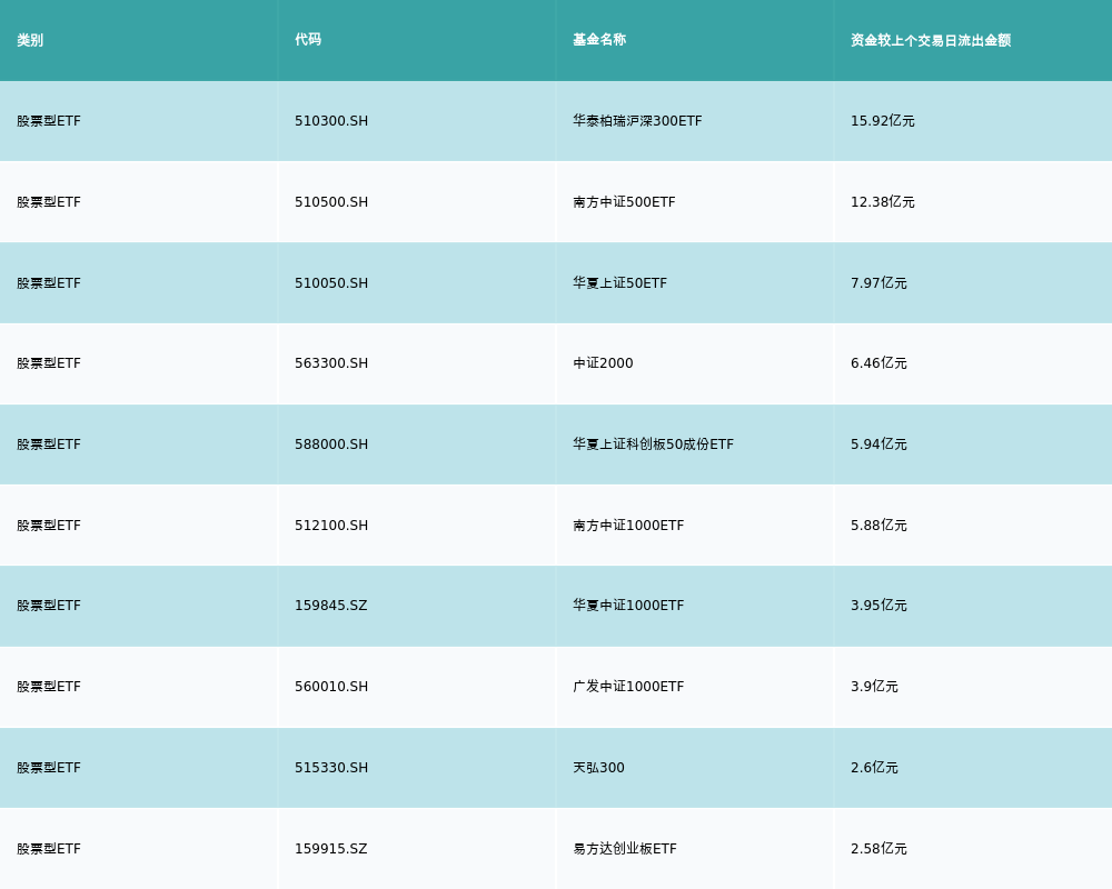 昨日股票型ETF资金流出最多的3支ETF及其流入金额分别为:华泰柏瑞沪深300ETF(流出15.92亿元)、南方中证500ETF(流出12.38亿元)、华夏上证50ETF(流出7.97亿元)。资金流出前10详情见下表: