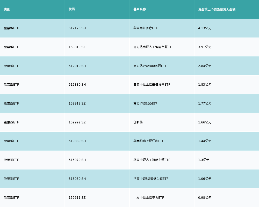 昨日股票型ETF资金流入最多的3支ETF及其流入金额分别为:华宝中证医疗ETF(流入4.13亿元)、易方达中证人工智能主题ETF(流入3.91亿元)、易方达沪深300医药ETF(流入2.84亿元)。资金流入前10详情见下表: