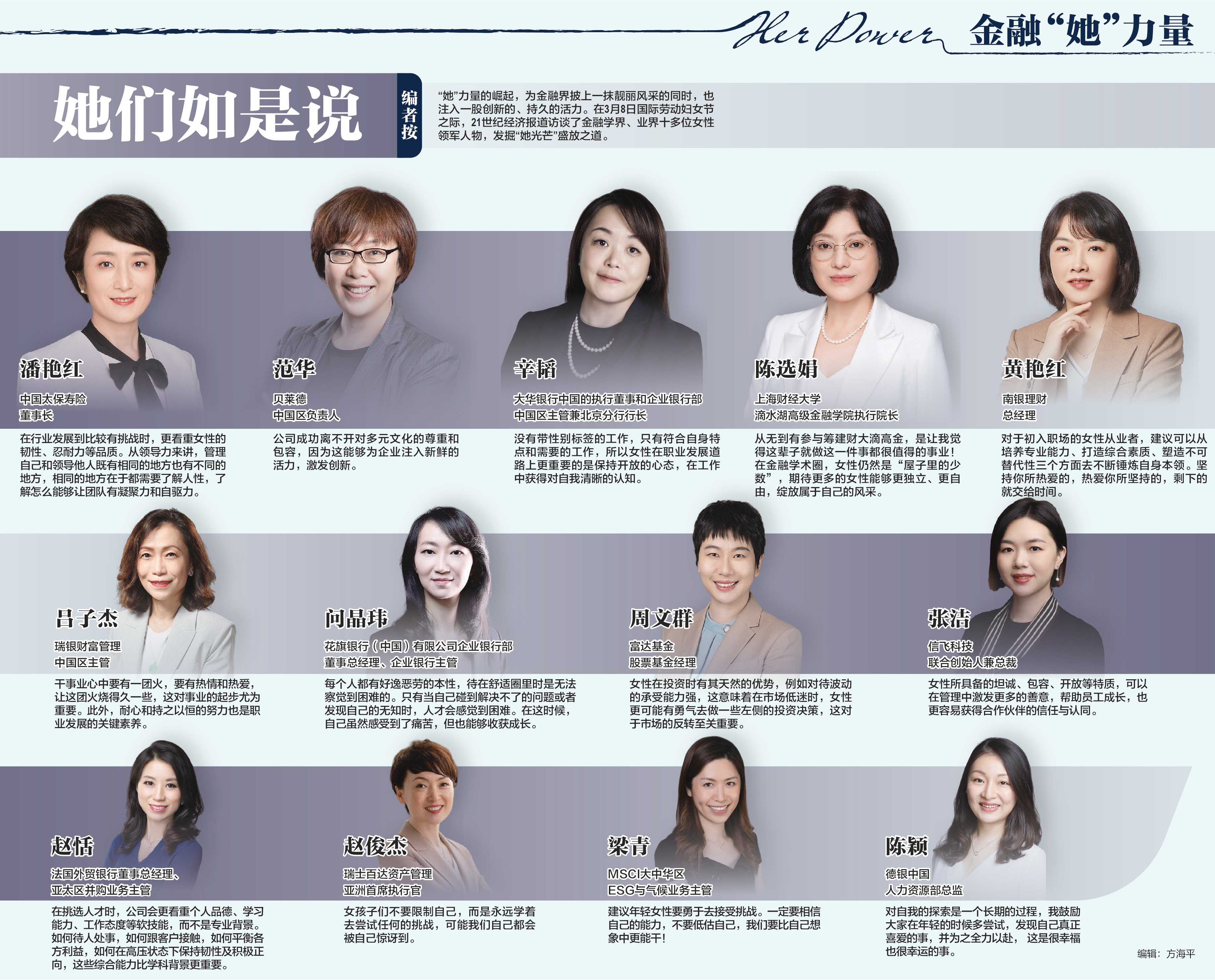 编者按:“她”力量的崛起,为金融界披上一抹靓丽风采的同时,也注入一股创新的、持久的活力。在3月8日国际劳动妇女节之际,21世纪经济报道访谈了金融学界、业界十多位女性领军人物,发掘“她光芒”盛放之道。