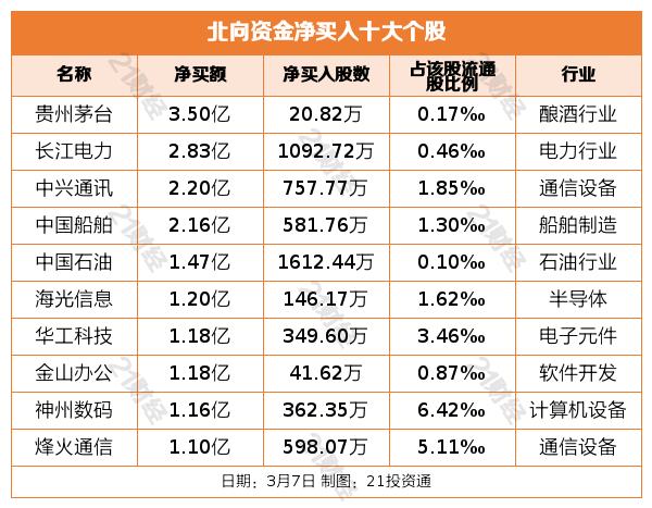 个股方面,北向资金净买入贵州茅台(600519.SH)、长江电力(600900.SH)、中兴通讯(000063.SZ)、中国船舶(600150.SH)、中国石油(601857.SH)居前,其中,贵州茅台被净买入3.50亿元,长江电力被净买入2.83亿元,中兴通讯被净买入2.20亿元,中国船舶被净买入2.16亿元,中国石油被净买入1.47亿元。