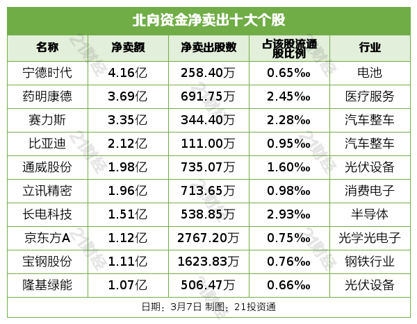 北向资金净卖出宁德时代(300750.SZ)、药明康德(603259.SH)、赛力斯(601127.SH)、比亚迪(002594.SZ)、通威股份(600438.SH)居前,其中,宁德时代被净卖出4.16亿元,药明康德被净卖出3.69亿元,赛力斯被净卖出3.35亿元,比亚迪被净卖出2.12亿元,通威股份被净卖出1.98亿元。